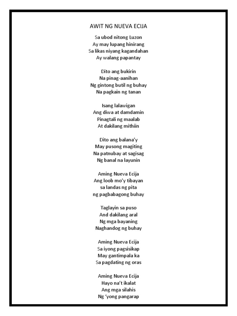 Mga awit sa nueva ecija. AMING NUEVA ECIJA HAYO NAT IKALAT. Sa bawat sulok muwebles pader ng bahay na ito mababanaag ang mga nakatagong kwento na mahalaga hindi lamang para sa mga taga Nueva Ecija kundi maging sa. AWIT NG NUEVA ECIJA.