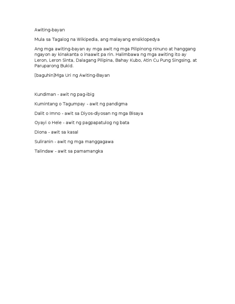Learn vocabulary terms and more with flashcards games and other study tools. Awitin sa panahon ng pamamanhikan o sa kasal. Halimbawa ng mga awiting ito ay Leron Leron Sinta Dalagang Pilipina Bahay Kubo Atin Cu Pung Singsing Manang Biday at Paruparong Bukid.